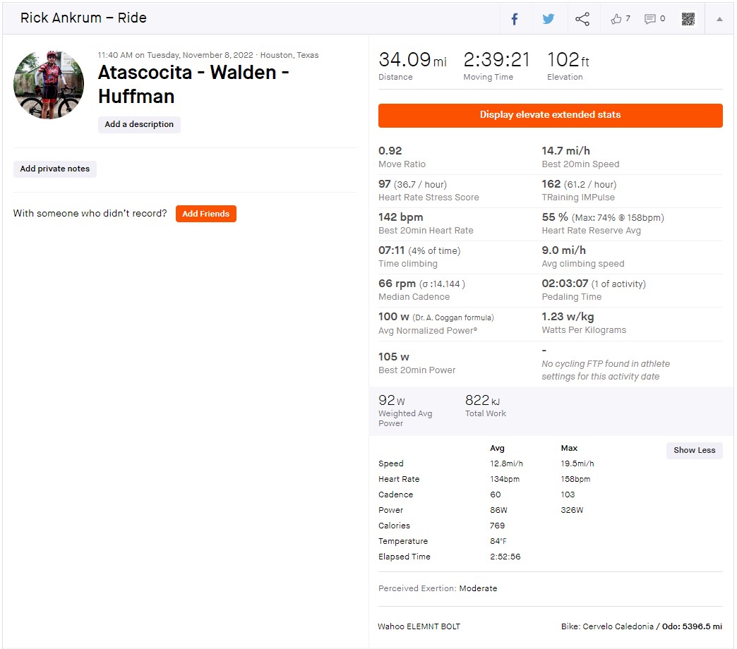 11-8-2022 Strava Ride Data Summary Atascocita-Walden-Huffman