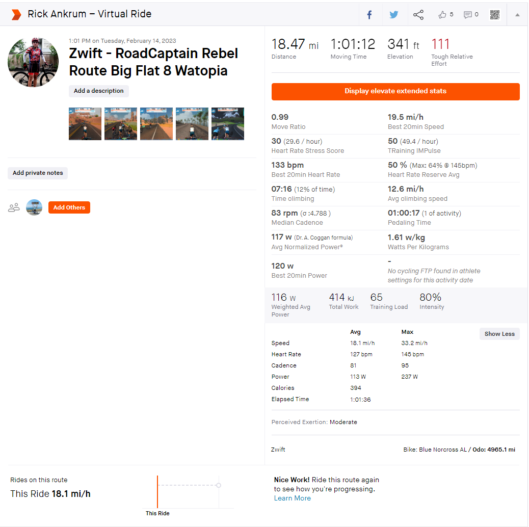 Continue reading →2-14-2023 Strava Zwift Ride Summary Watopia RoadCaptain Rebel Route Big flat 8