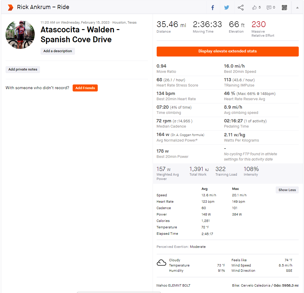 2-15-2023 Strava Ride Summary Atascocita-Walden-Spanish cove Drive