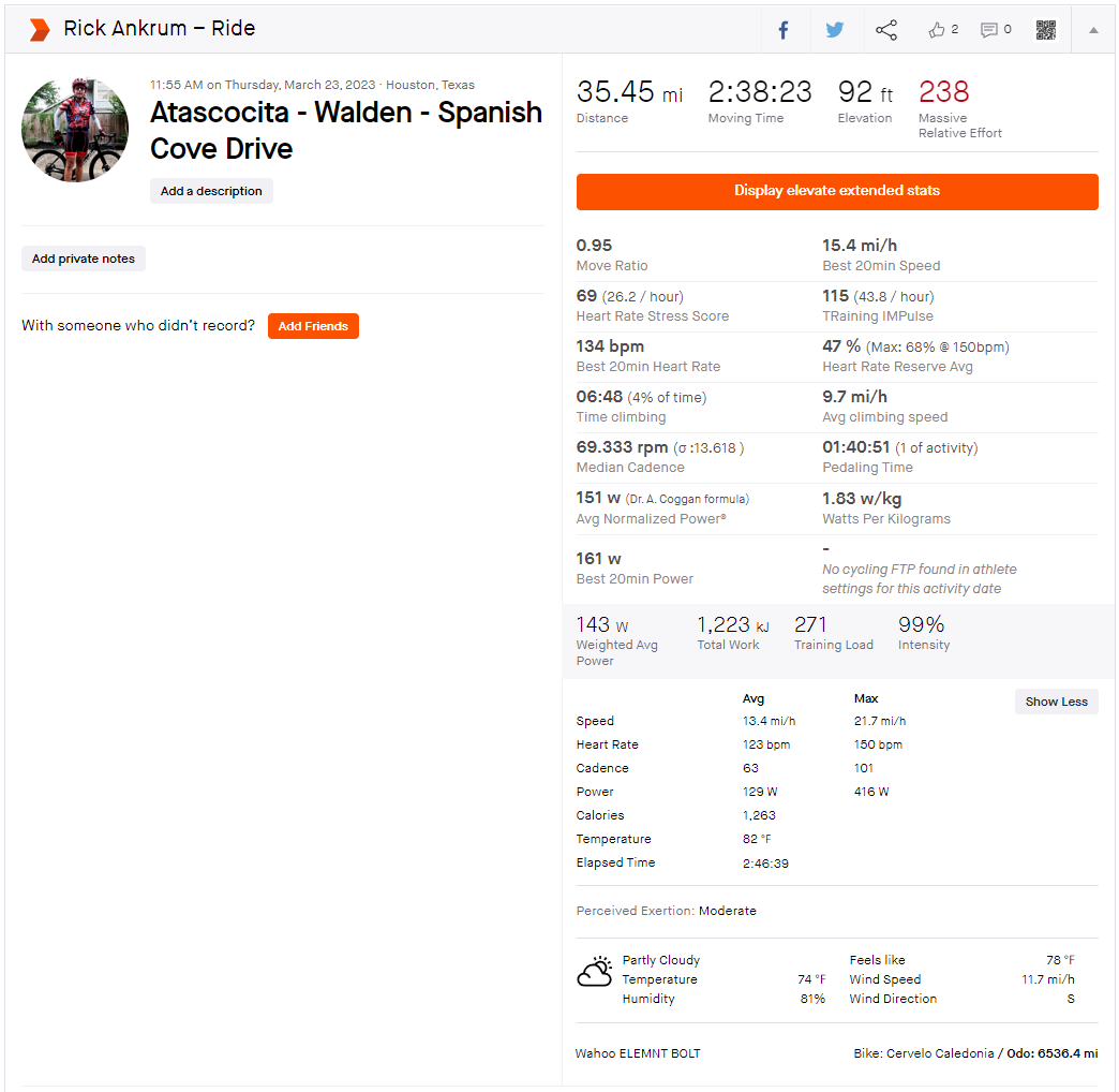 3-23-2023 Strava Ride Summary Atascocita-Walden-Spanish Cove