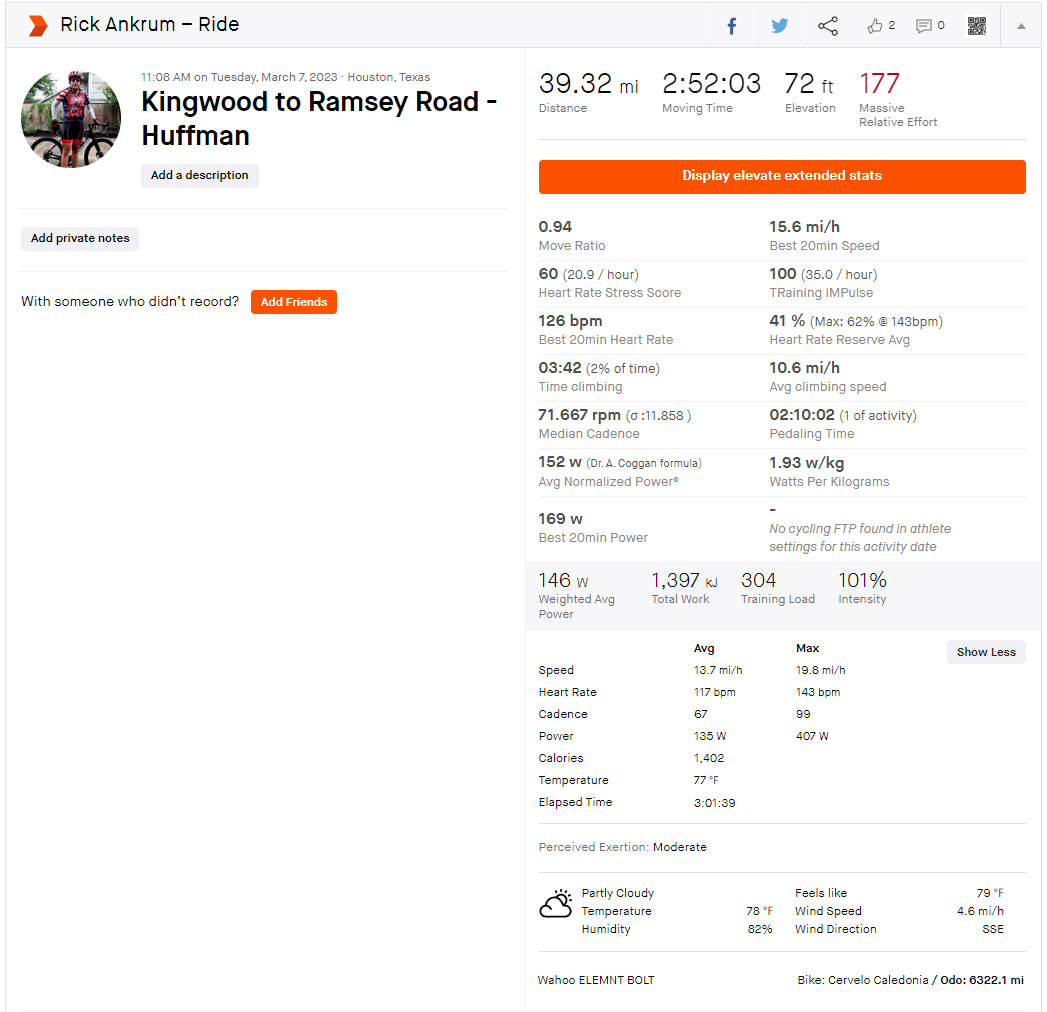 3-7-2023 Strava Ride Summary Kingwood to Ramsey Road – Huffman